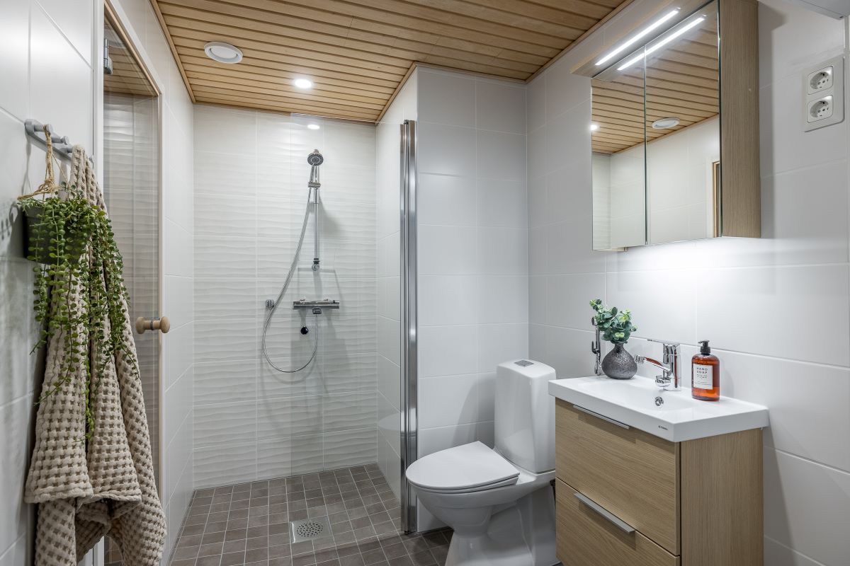 Avara viidennen kerroksen kolmio, jossa keittiö ja olohuone ovat yhtä suurta tilaa. Makuuhuoneiden vaatehuoneet tarjoavat rutkasti säilytystilaa. Kodin keittiössä on "Raikas" sisustustyyli, jonka alakaapistoissa ja korkeissa kaapeissa on kaunis puusyykuvio, yläkaapistot ovat raikkaan valkoiset. Kodin lattiamateriaalina on Tarkettin 3-sauvainen vaalea parketti. Asunnossa oma sauna ja tilava lasitettu parveke länteen päin. Parvekkeella myös varasto esimerkiksi kausitavaroiden säilytystä varten.