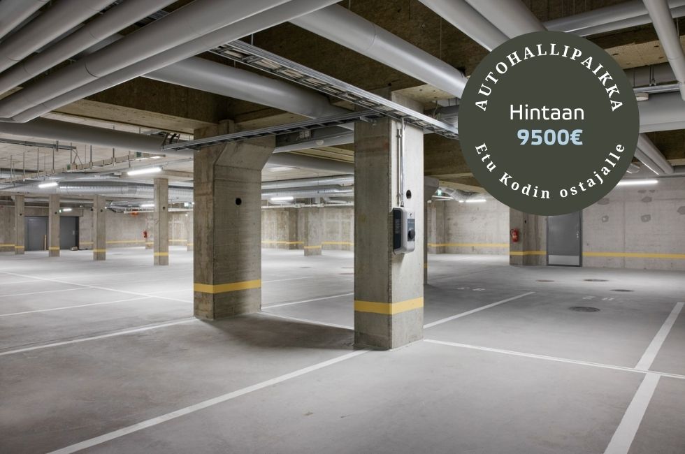 Kevään kampanjaetuna tarjoamme asunnon ostajalle autohallipaikan etuhintaan 9 500 € tai kaksi autohallipaikkaa 15 000 €:lla.Normaalihinta on 25 000 € / paikka, etusi voi olla jopa 35 000 €. Latausasema sähköautolle saatavilla 2 200 € lisähintaan.