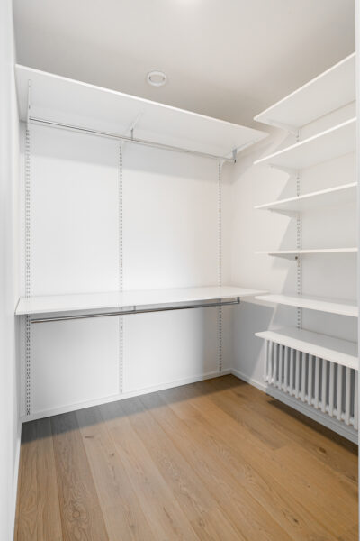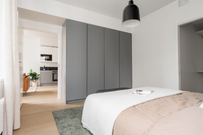 Kulma-asunnon ikkunat avautuvat kahteen ilmansuuntaan. Tästä kaksiosta ei säilytystilaa puutu - tilavan makuuhuoneen yhteydessä kaapistojen lisäksi erillinen vaatehuone. Huonekorkeus n. 2,7 m.
