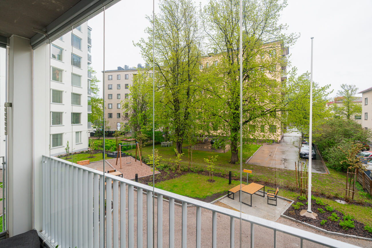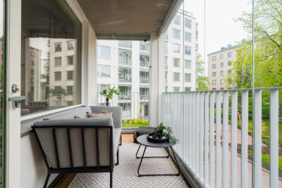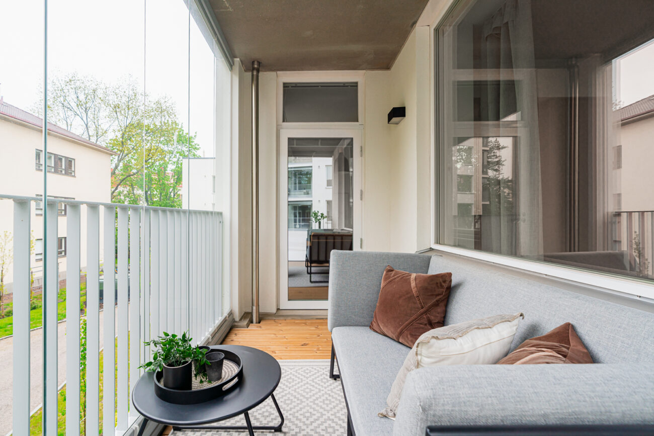 Toimivapohjainen kaksio lasitetulla parvekkeella.