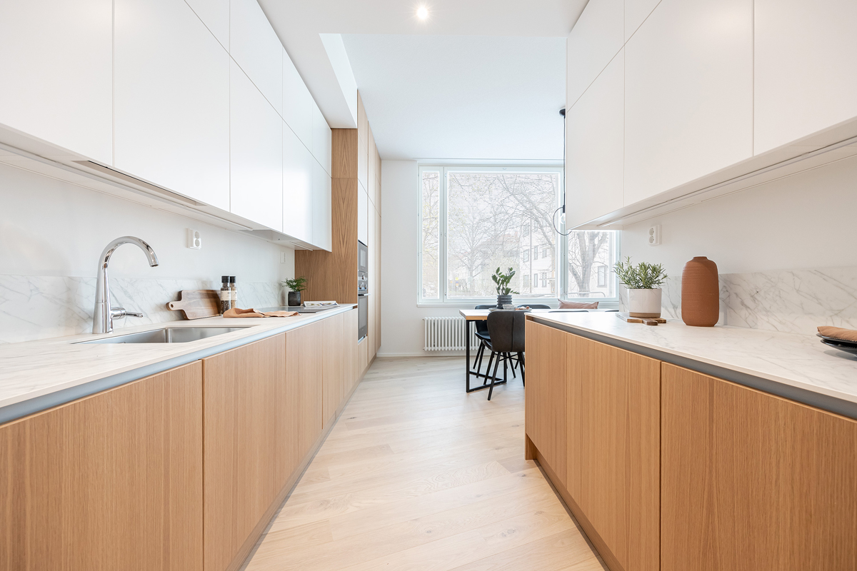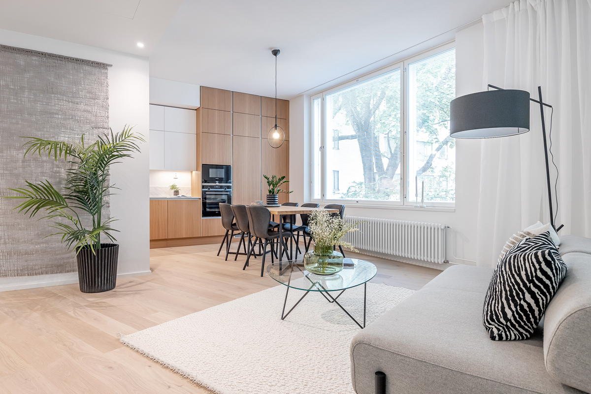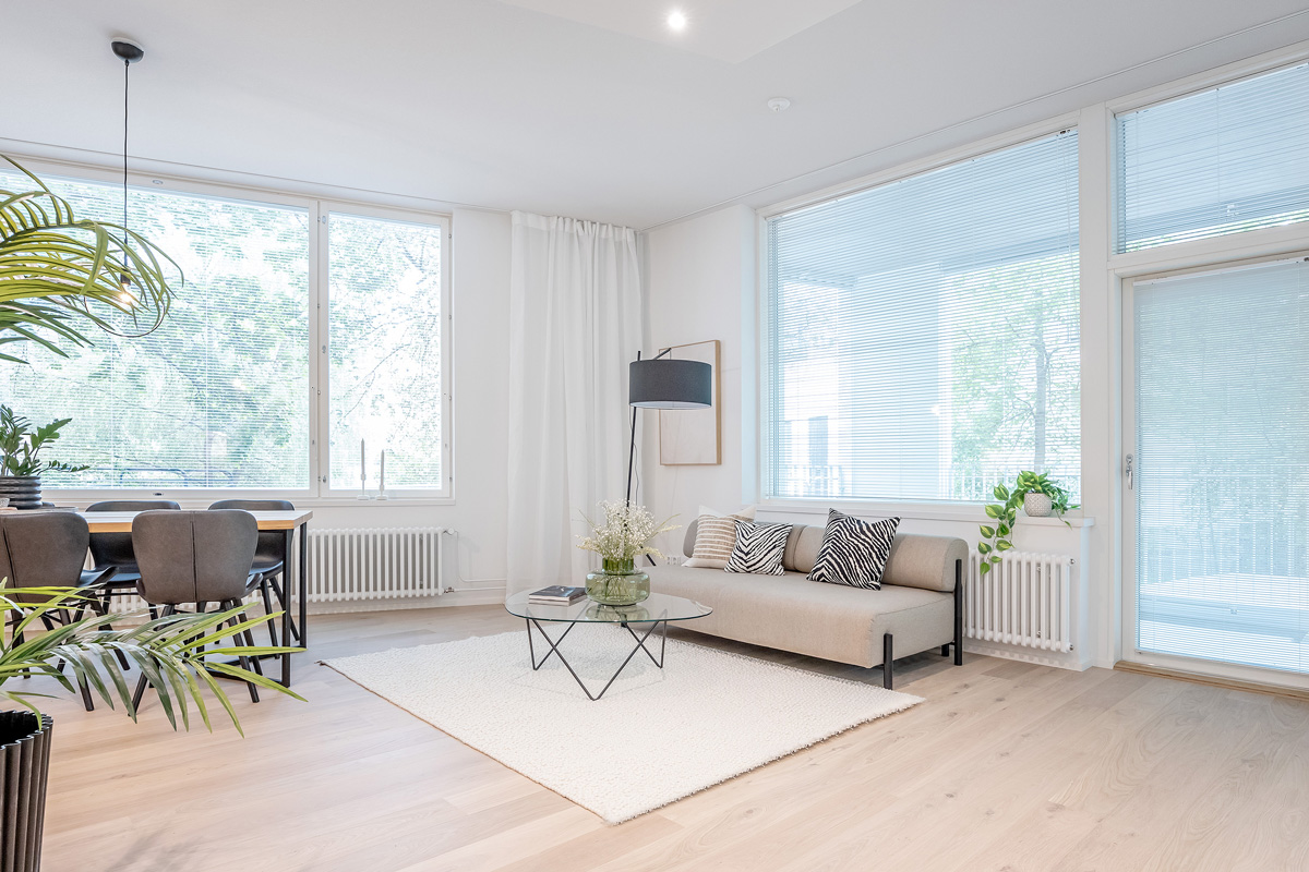 Selkeäpohjaiset ja tilavasti mitoitetut huoneistot tulvivat luonnonvaloa lähes katon rajaan ulottuvien ikkunoiden ansiosta. Sisustusmateriaalit ovat korkealuokkaisia, ja tarkkaan harkitut yksityiskohdat tekevät asunnoista ainutlaatuisia. Kaikki tämä on tehty Töölön henkeä kunnioittaen, luoden kodin, joka on sekä tyylikäs että ajaton.