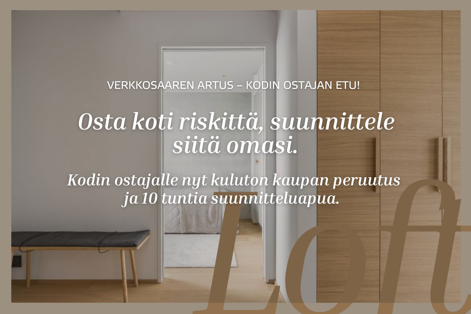 Oma asunto vielä myymättä? Valitse Artus Loft huolettomasti: saat 10 tuntia sisustusapua pohjaratkaisun, keittiön toimivuuden ja valaistuksen hiomiseen – ja kaupan teet kuluttomalla kaupan peruutuksella, joka antaa sinulle mielenrauhan päätöksen hetkellä.