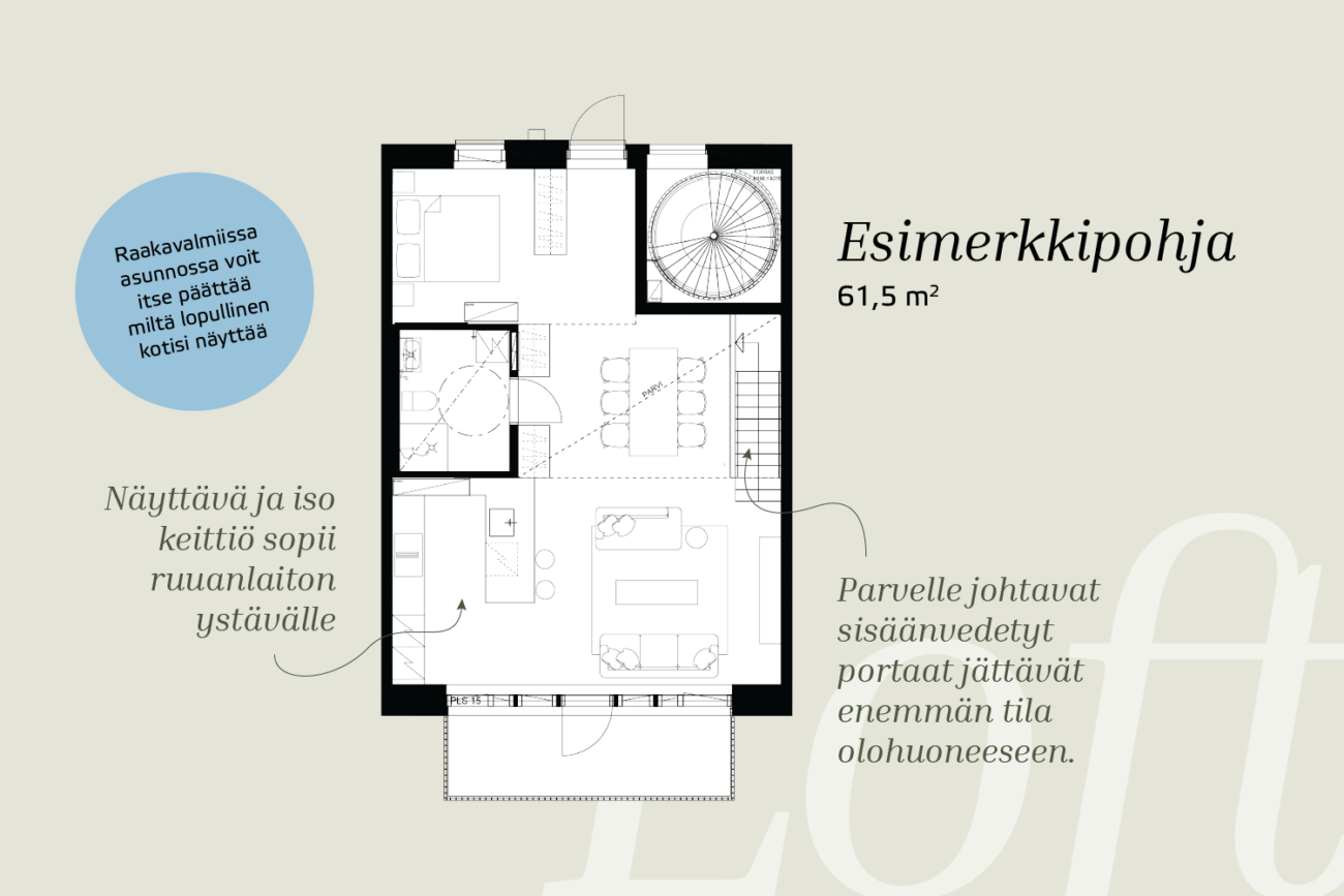 Suunnittele haluamasi huonejako tai unohda väliseinät kokonaan. Pääset itse toteuttamaan unelmiesi keittiön, lattiapinnoitteet sekä mahdolliset väliseinät. Huonekorkeus on neljä metriä – tämä mahdollistaa nukkumaparviratkaisun, joka lisää asuintilaasi. Raakavalmiissa loft-asunnossa on valmiiksi toteutetut wc- ja kylpyhuonetilat. Muusta päätät sinä.