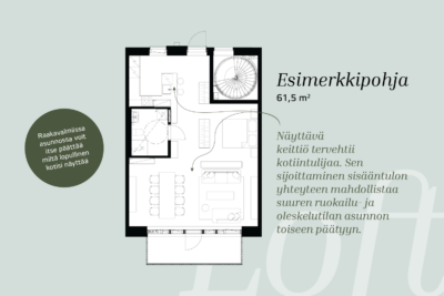 Huomioithan, että ilmoituksessa esitetyt kuvat ovat havainnekuvia, eivätkä välttämättä vastaa juuri tätä asuntoa. Kuvat ja esimerkkipohjat on tarkoitettu antamaan yleiskuva mahdollisista toteutusvaihtoehdoista. Myynnissä olevan huoneiston tarkka pohjaratkaisu löytyy asunnon pohjakuvasta, ja lopulliset yksityiskohdat vahvistetaan myyntiasiakirjoissa.