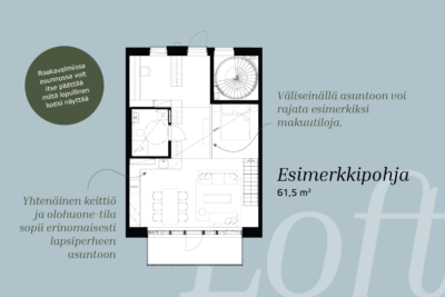 Loft-koti ei ole kompromissi vaan juuri sellainen koti kuin sinä haluat. Huonekorkeus on parhaimmillaan neljä metriä – tämä mahdollistaa kevytrakenteisen nukkumaparviratkaisun, joka lisää asuintilaasi.