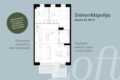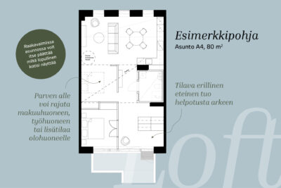 Suunnittele haluamasi huonejako tai unohda väliseinät kokonaan. Pääset itse toteuttamaan unelmiesi keittiön, lattiapinnoitteet sekä mahdolliset väliseinät. Huonekorkeus on neljä metriä – tämä mahdollistaa nukkumaparviratkaisun, joka lisää asuintilaasi. Raakavalmiissa loft-asunnossa on valmiiksi toteutetut wc- ja kylpyhuonetilat. Muusta päätät sinä.