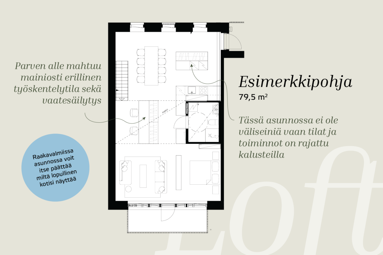 Suunnittele haluamasi huonejako tai unohda väliseinät kokonaan. Pääset itse toteuttamaan unelmiesi keittiön, lattiapinnoitteet sekä mahdolliset väliseinät. Huonekorkeus on neljä metriä – tämä mahdollistaa nukkumaparviratkaisun, joka lisää asuintilaasi. Raakavalmiissa loft-asunnossa on valmiiksi toteutetut wc- ja kylpyhuonetilat. Muusta päätät sinä.