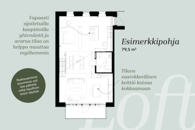 Huomioithan, että ilmoituksessa esitetyt kuvat ovat havainnekuvia, eivätkä välttämättä vastaa juuri tätä asuntoa. Kuvat ja esimerkkipohjat on tarkoitettu antamaan yleiskuva mahdollisista toteutusvaihtoehdoista. Myynnissä olevan huoneiston tarkka pohjaratkaisu löytyy asunnon pohjakuvasta, ja lopulliset yksityiskohdat vahvistetaan myyntiasiakirjoissa.