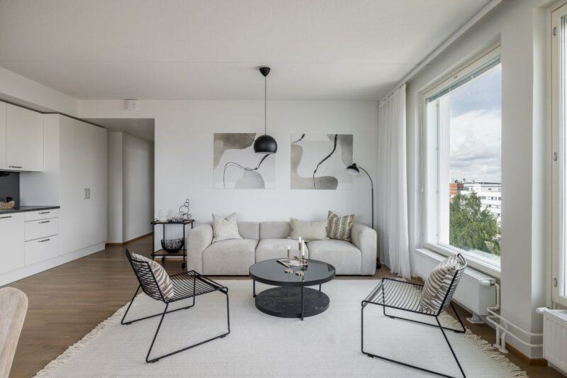 Myytävien asuntojen sisustusmateriaalit on huolellisesti valittu vastaamaan tämän päivän asumisen toiveita. Asuntoihin on valittu joko Ajaton tai Raikas sisustustyyli.