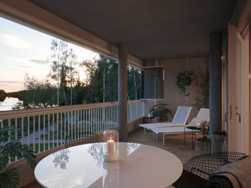 Laajat, näkymiltään suojaisat parvekkeet ja terassit avautuvat aina etelään järvelle, tai länteen ilta-auringon suuntaan.