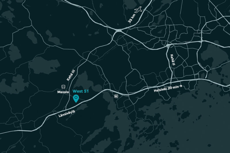 West51 sijaitsee Kehä III:n sisäpuolella, suoraan Länsiväylän liittymässä. Alueelta pääsee nopeasti kaikkiin pääkaupunkiseudun suuntiin – ilman liikennevaloja ja keskustan ruuhkia.